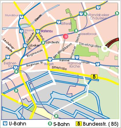 Aus Richtung Lübeck/Berlin über die A1 / A24 bis zum Horner Kreisel, 2te. Ausfahrt rechts auf die Sievekingallee in Richtung Berliner Tor.Dann ca.1000m geradeaus,. An der 3ten Ampel links in den Sievekingdamm.
